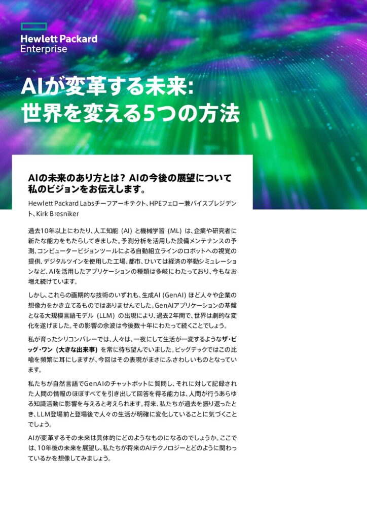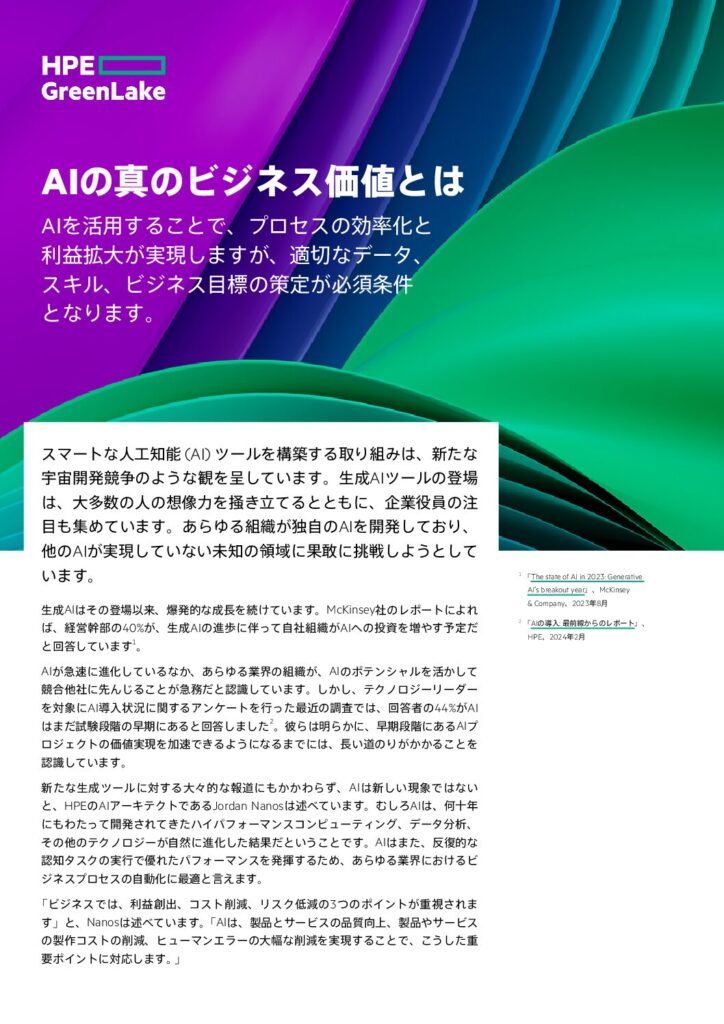 HPEとNVIDIAがAI向けに提供するターンキーソリューションのご紹介 GenAIの可能性は計り知れません。しかし、開発におけるさまざまな課題によって、最も野心的な企業の取り組みも阻害されることになります。広範に分散するデータの管理、展開の効率的な拡張が困難であることなど、AI開発プロセスでは、データの収集から結果の監視まで、常に複雑さが課題となります。しかし、この複雑さを解消する方法があります。 従来のAI開発サイクルとHPEのアプローチを比較した詳細をぜひご覧ください。NVIDIA AI Computing by HPEの導入で、ターンキー型ソリューションを活用してAI開発のあらゆる段階を簡素化できるようになります。 6399-JP-HPE and NVIDIA offer a turnkey solution for GenAI. Here’s how. ファーストネーム苗字Eメール会社名会社の規模選んでください…1 […]