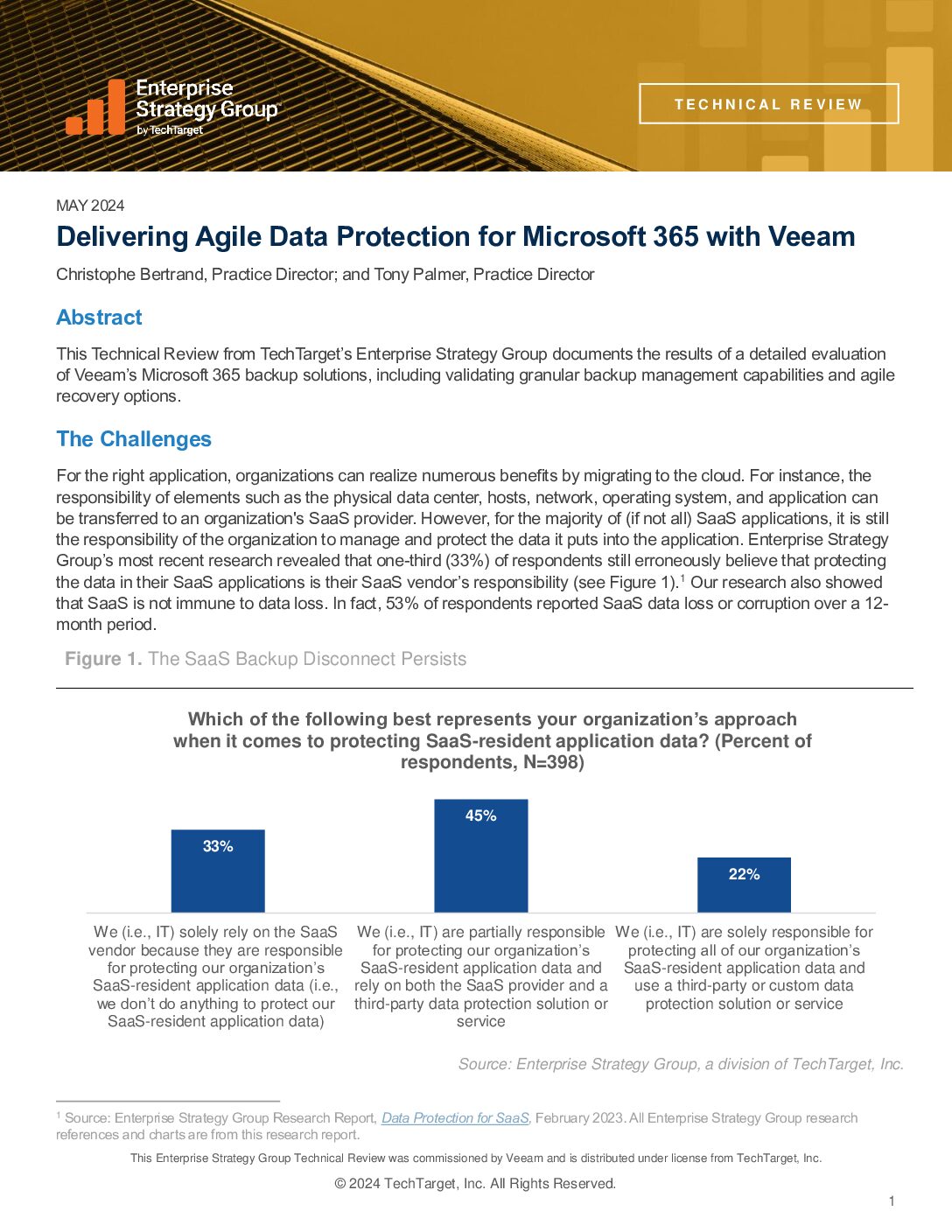 Enterprise Strategy Group’s most recent research revealed that SaaS applications are not immune to data loss. In fact, 53% of respondents reported SaaS data loss or corruption over a 12‑month period. This technical review from Tech Target’s Enterprise Strategy Group documents the results of a detailed evaluation of Veeam’s Microsoft 365 backup solutions, including validating granular backup management capabilities and agile recovery options.