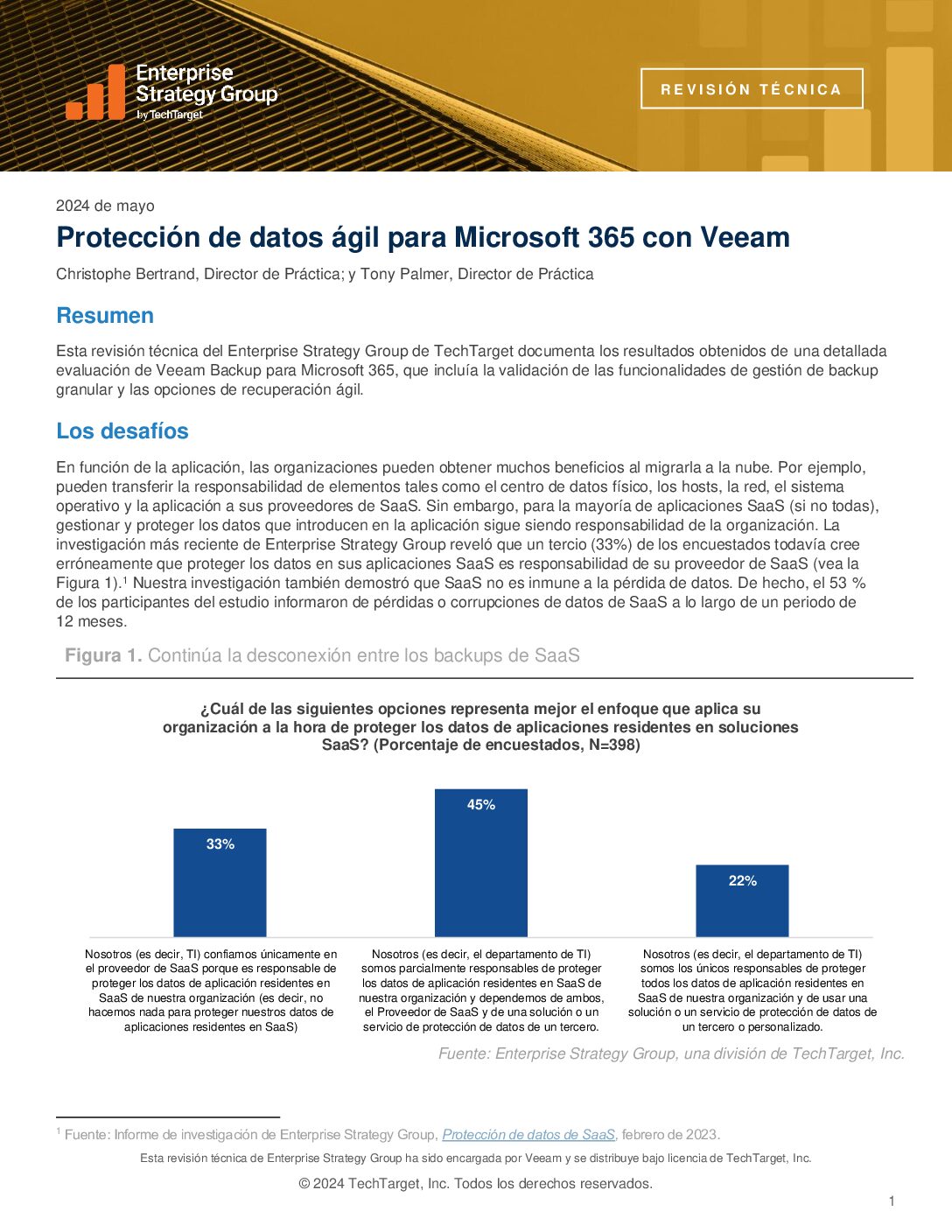 Esta revisión técnica del Enterprise Strategy Group de TechTarget documenta los resultados obtenidos tras una detallada evaluación de las soluciones de backup de Veeam para Microsoft 365, incluidas la validación de las funcionalidades de gestión de backup granular y las opciones de recuperación ágil.