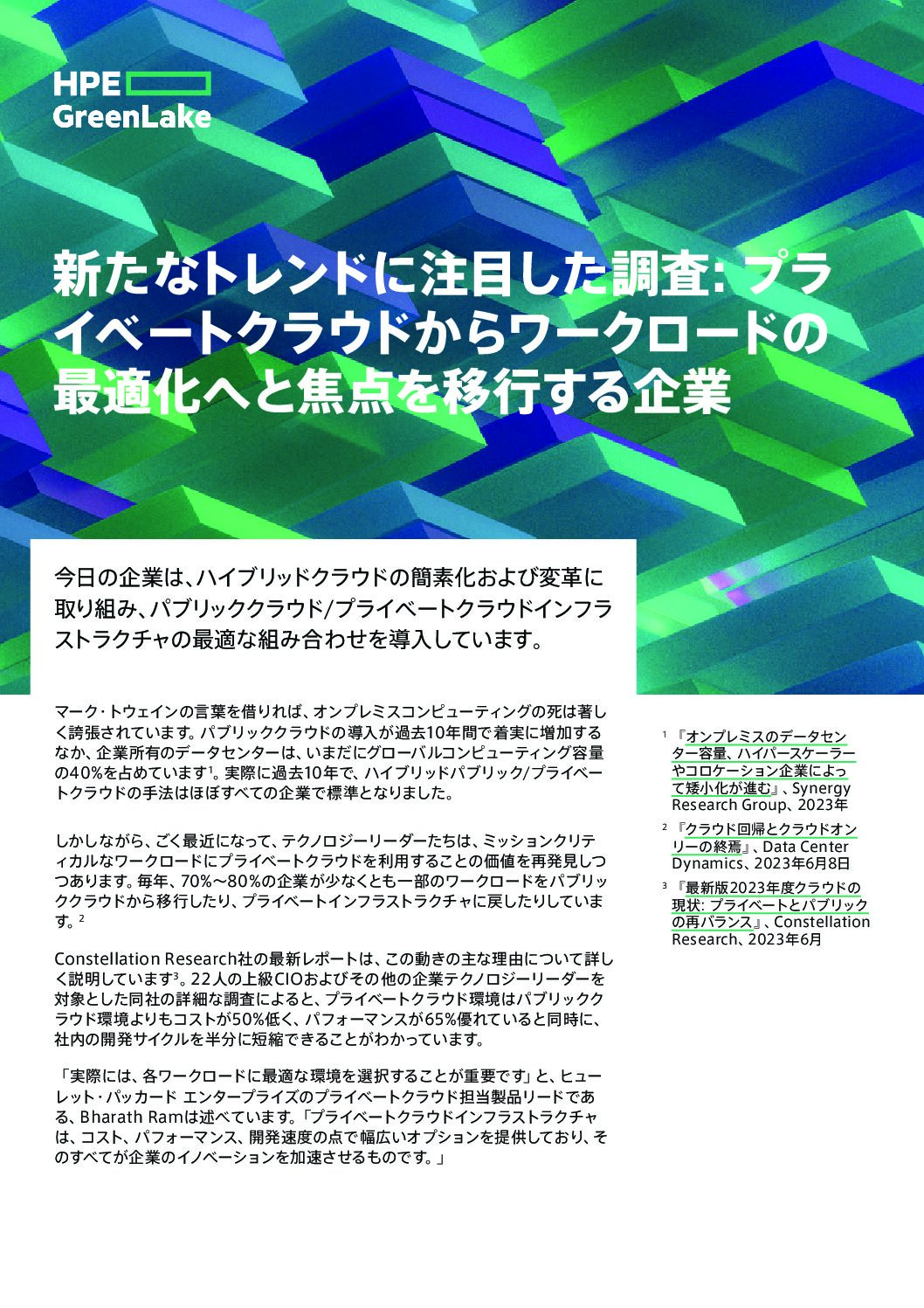 ワークロードに最適な価格、セキュリティ、制御性を求める組織にとって、パブリッククラウドのみを活用するという、これまで当然であった戦略はもはや通用しなくなっています。この新しいアナリストレポートは、今日のITリーダーたちによるパブリッククラウド、プライベートクラウドについての見解を解説しています。また本書では、Constellation Researchの要約、そしてHPEの見解もご覧いただけます。