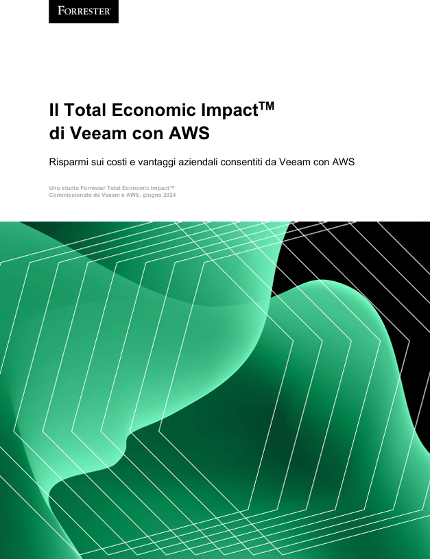 Scarica lo studio Veeam AWS TEI per scoprire i risultati del Total Economic Impact di Forrester in termini di risparmio sui costi e vantaggi per il business.